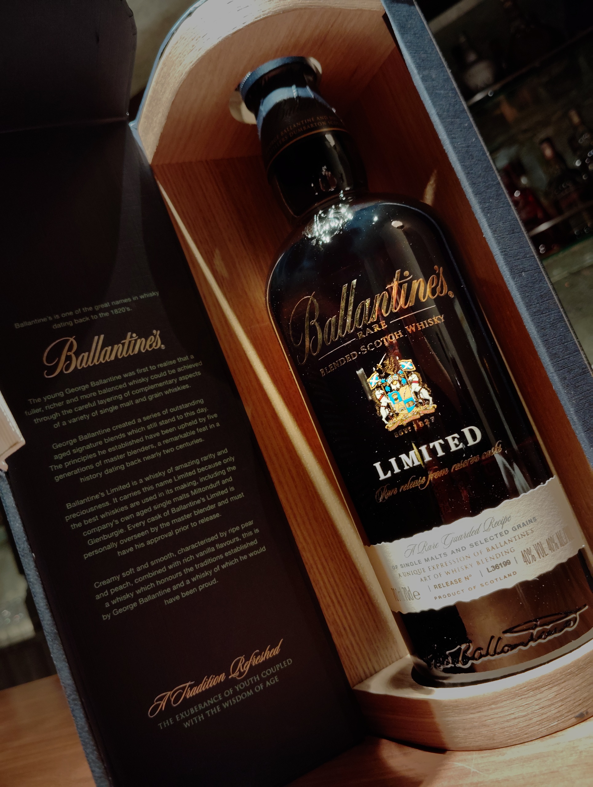 Ballantine’s LIMITED is a limited edition blended Scotch made in homage to the style of the great founder George Ballantine. By combining precious, long-aged malt whiskey, aged for over 30 years, with young grain whiskey, this bottle achieves an ideal blend with more freedom, differentiating it from 17-year and 30-year age labels, which can only be made using long-aged malt whiskey.